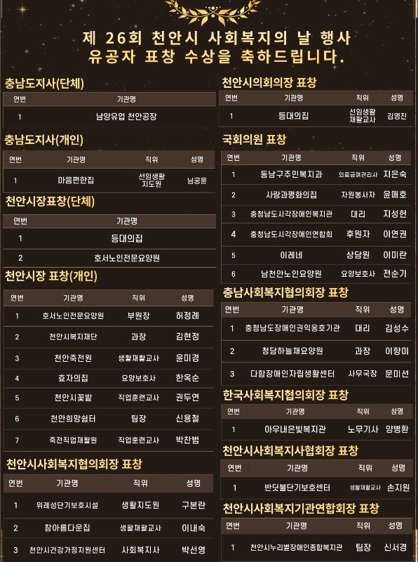 제 26회 천안시사회복지의 날 행사 유공자 표창수상 페이지 정보 작성자작성자 : 천사협 조회조회수 : 1,215회 작성일작성일 : 25-09-23 13:14 본문 수상을 축하 드립니다! 목록 이전글2025년 법인 정기 이사회의(2차) 개최 25.03.11 다음글「제26회 천안시사회복지의 날 행사」사회복지 유공자 추천 협조 요청 25.07.28